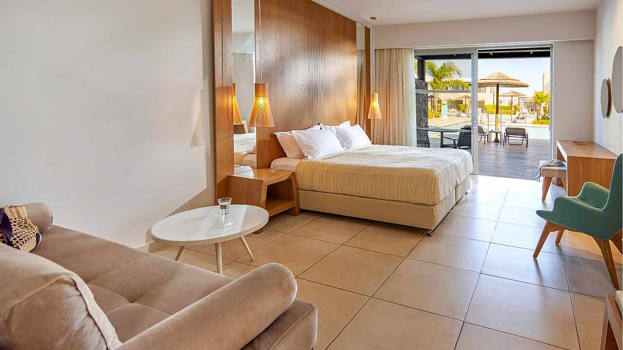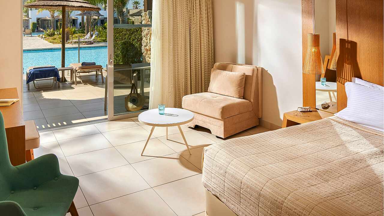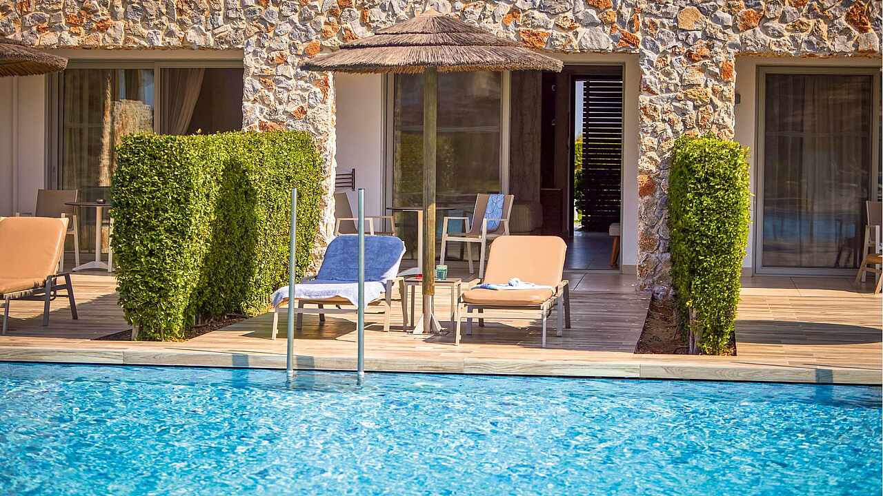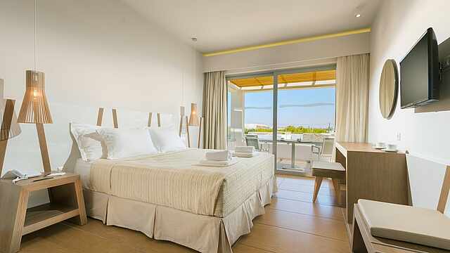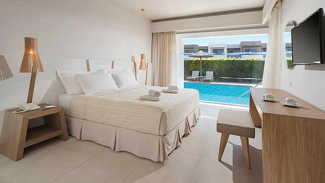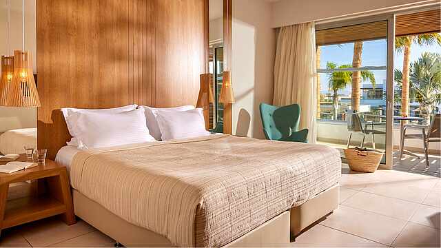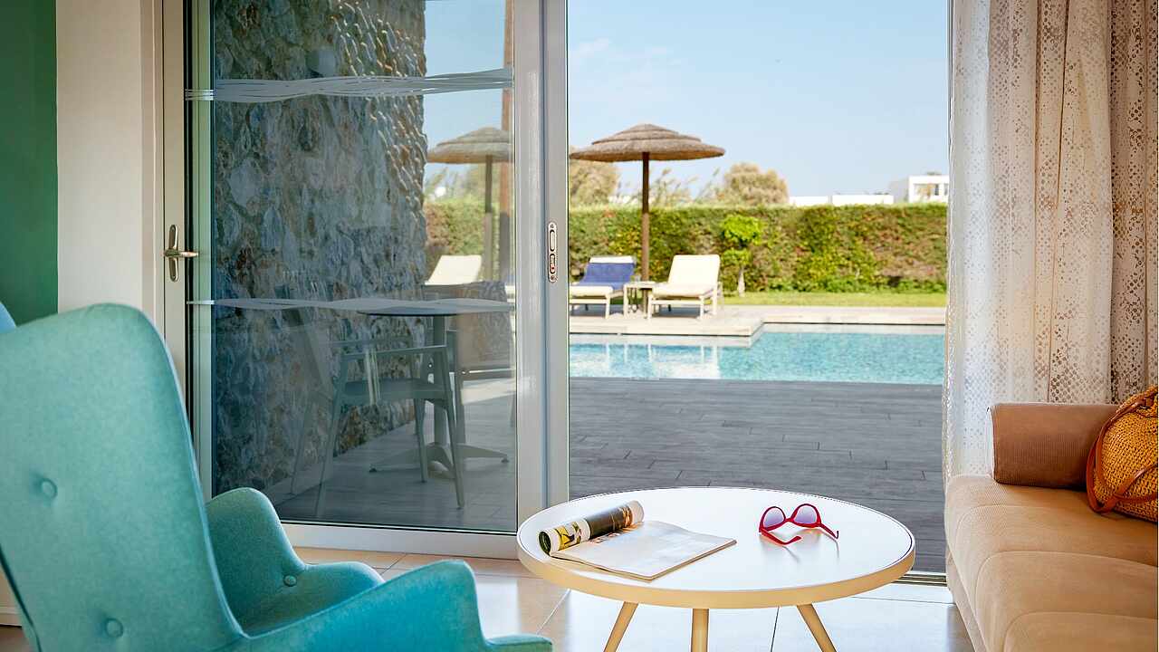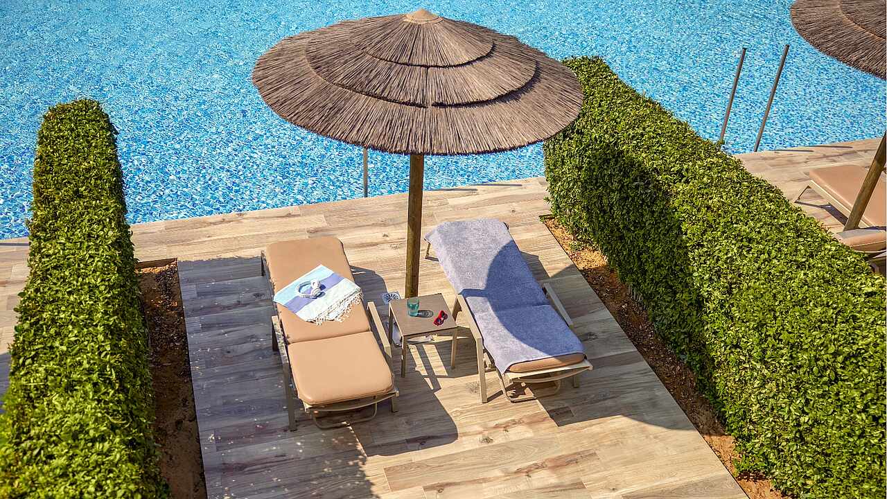 Eine gepflegte große Poollandschaft mit stylischen Unterkünften und das strahlend blaue Meer von Kos in direkter Sichtweite machen das TUI BLUE Palazzo Del Mare zu einem einzigartigen Erwachsenenhotel in Marmari. Die zeitgenössische Architektur kombiniert landestypische weiß gekalkte Fassaden mit Holz- und Steinelementen in einem erfrischenden Kontrast zum Blau des Wassers.
