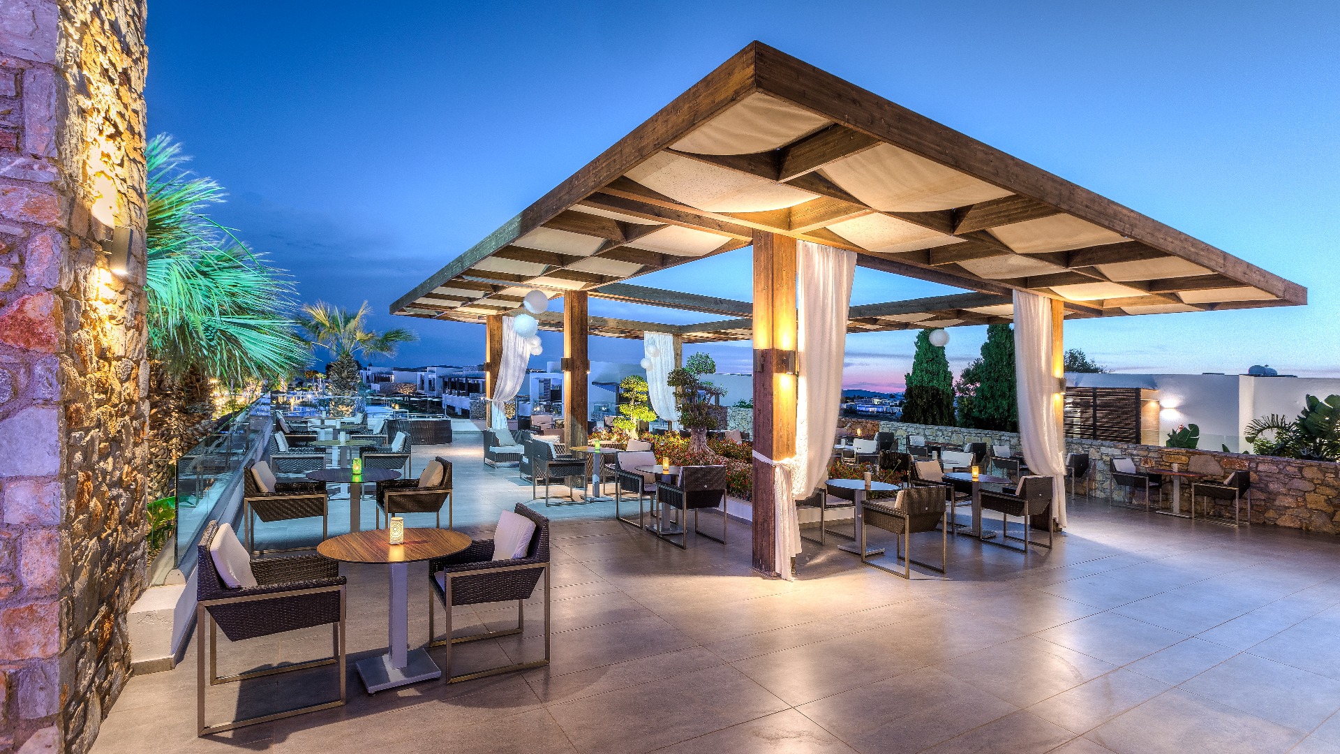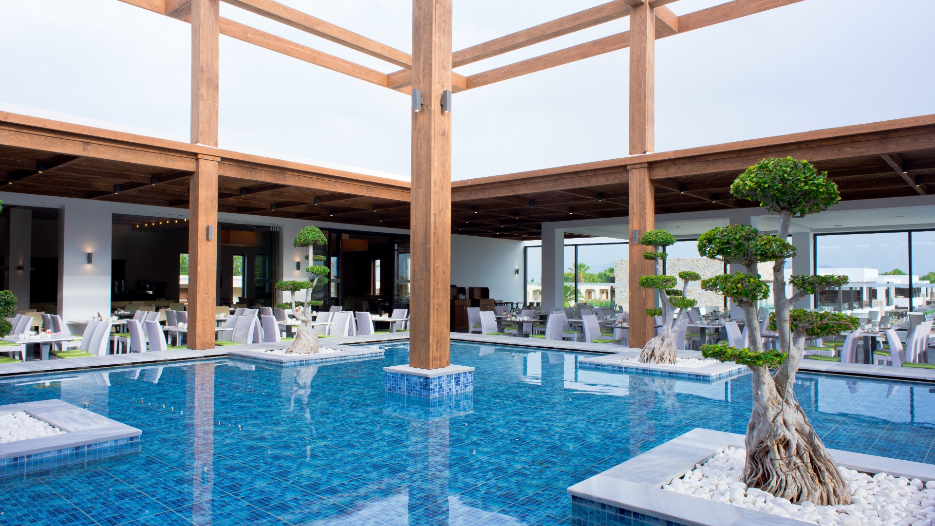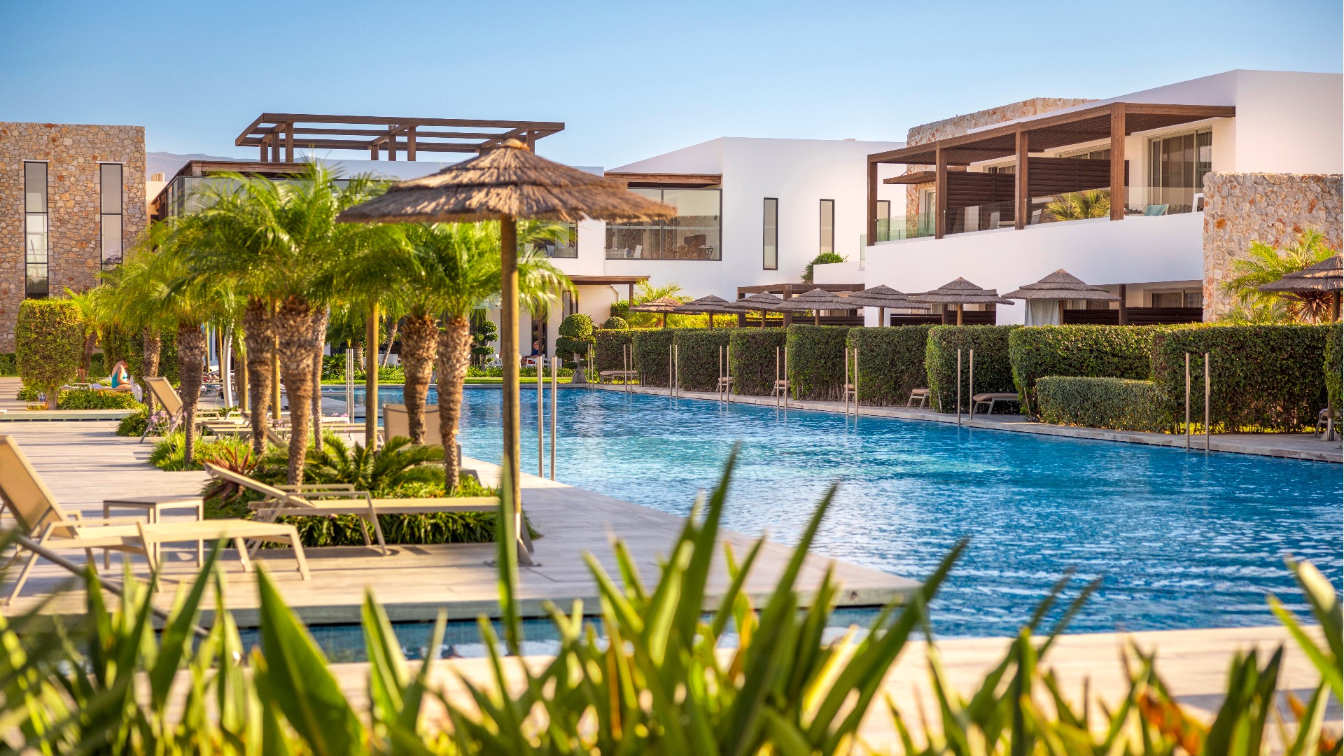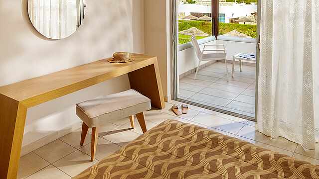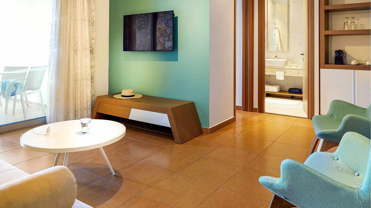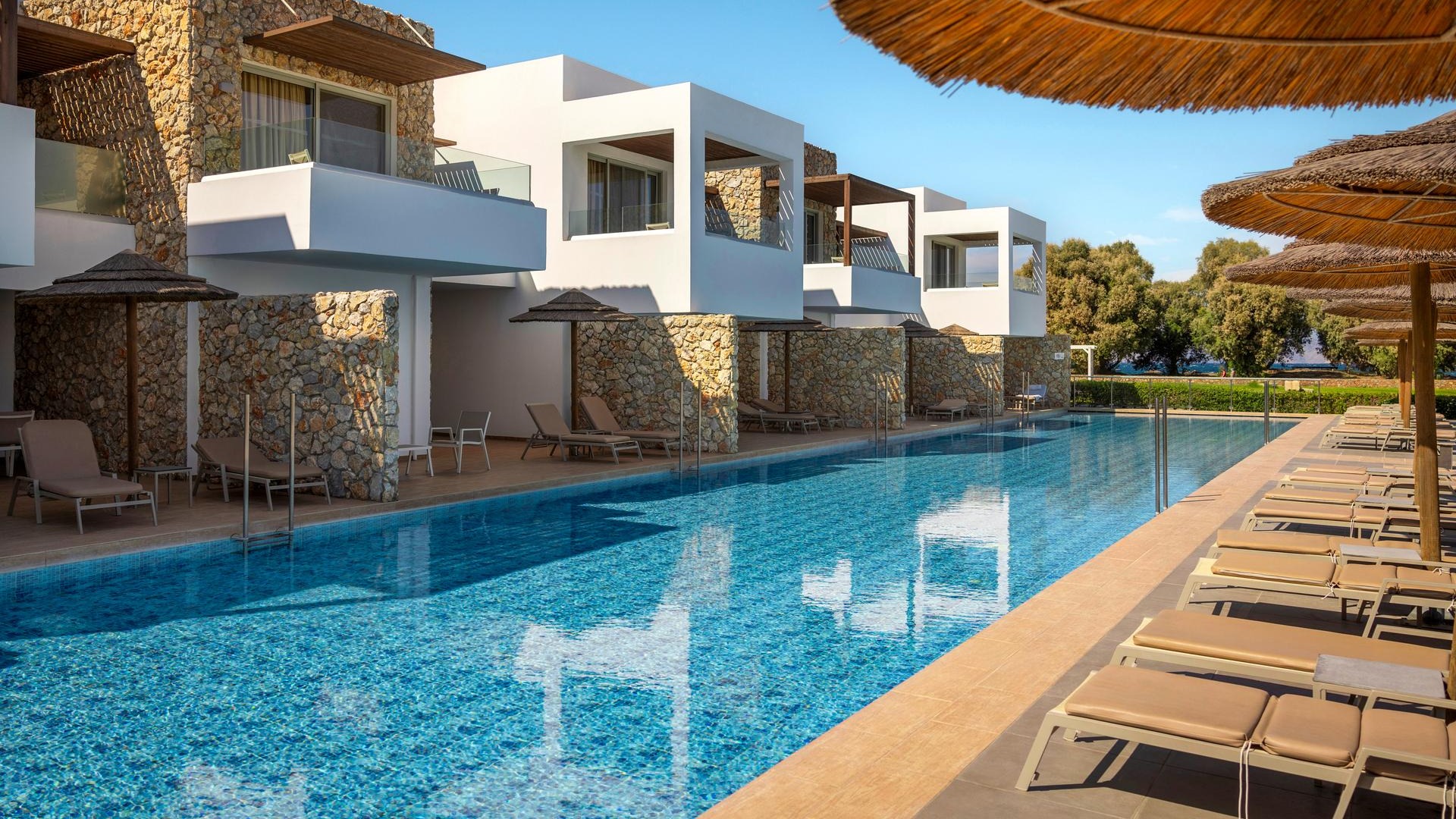 Eine gepflegte große Poollandschaft mit stylischen Unterkünften und das strahlend blaue Meer von Kos in direkter Sichtweite machen das TUI BLUE Palazzo Del Mare zu einem einzigartigen Erwachsenenhotel in Marmari. Die zeitgenössische Architektur kombiniert landestypische weiß gekalkte Fassaden mit Holz- und Steinelementen in einem erfrischenden Kontrast zum Blau des Wassers.