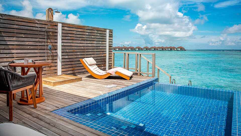 Float from your terrace directly into your private pool and enjoy romantic moments with a view of paradise at TUI BLUE Olhuveli Romance. Enter a state of total relaxation in the Maldives, where you'll be gazing at the colour of the incomparably beautiful sea.