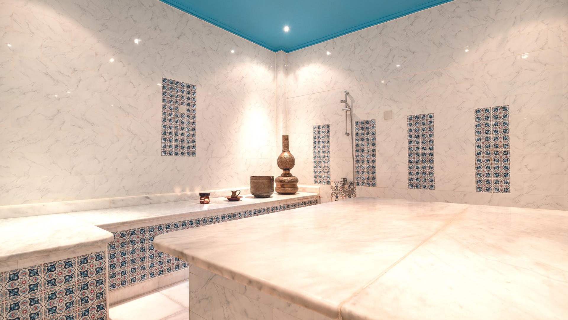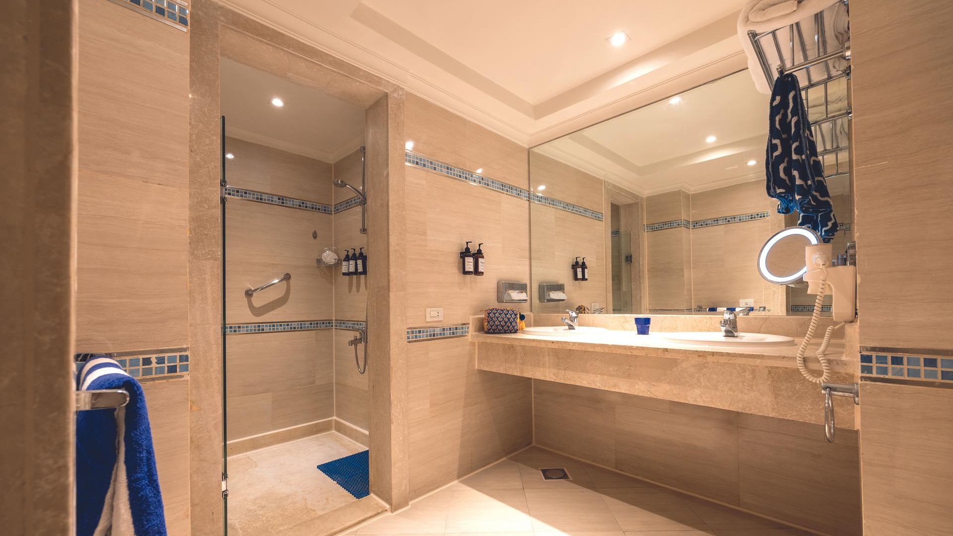 - Changing room, shower, sunloungers, towels, free of charge