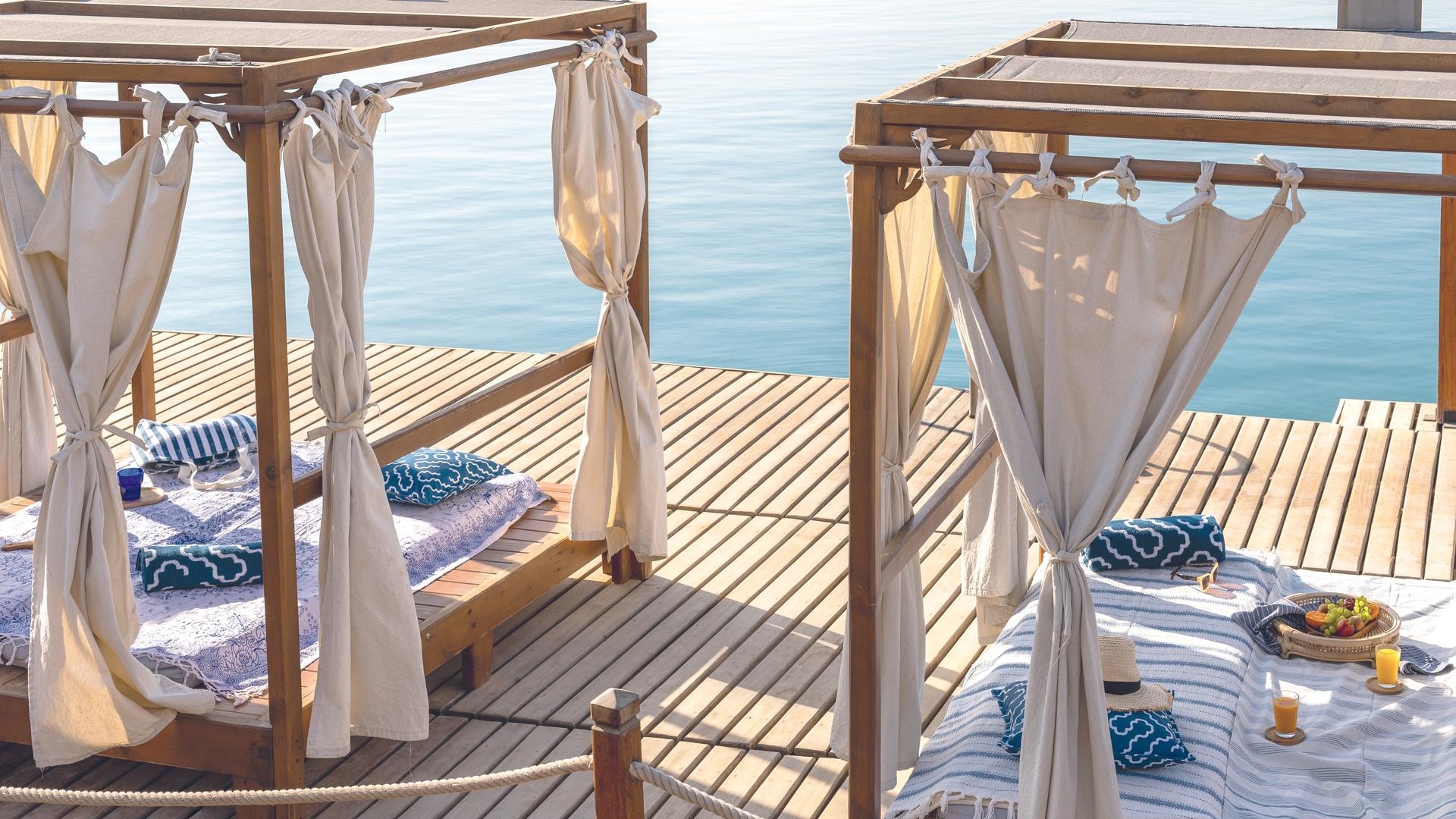 - Changing room, daybeds, hammocks, parasols, shower, sunloungers, towels, free of charge