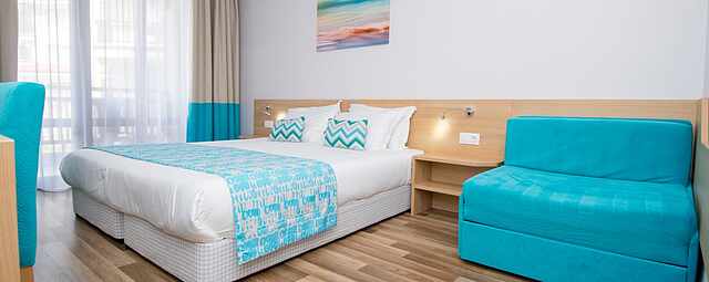 Pure holiday bliss and total relaxation — that's what you can expect at the TUI BLUE Nevis hotel on Bulgaria's popular Sunny Beach. From tasty food to delightful shows and entertainment, this family-friendly hotel prioritises the needs of parents and their children. Splash around in the spacious pool area, equipped with a water park with slides as well as a baby pool for the youngest guests. The hotel's exciting shows inspires the whole family. TUI BLUE Nevis promises unforgettable moments with your loved ones.