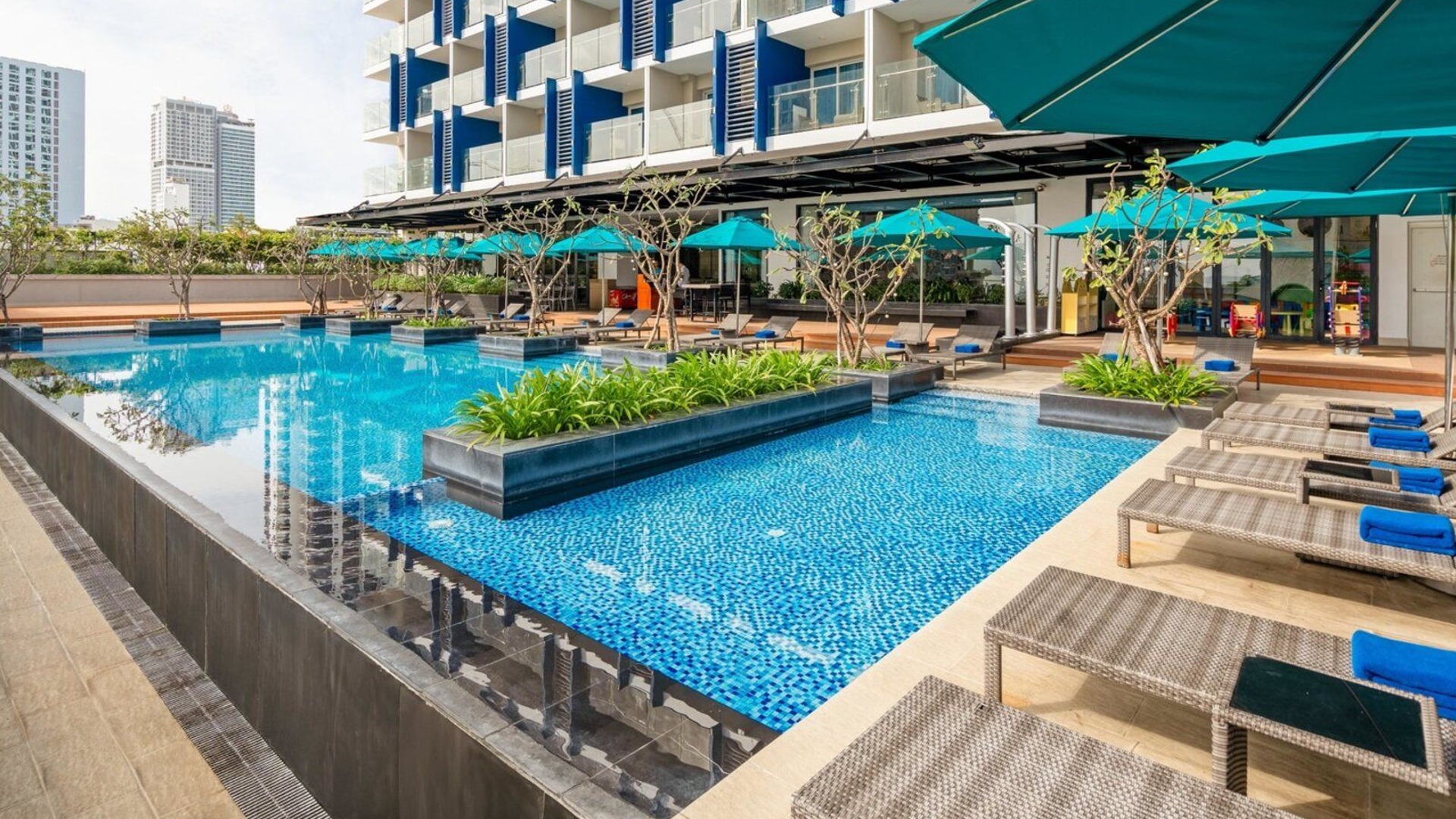 - Fully equipped with a pool, gym, and playroom for children